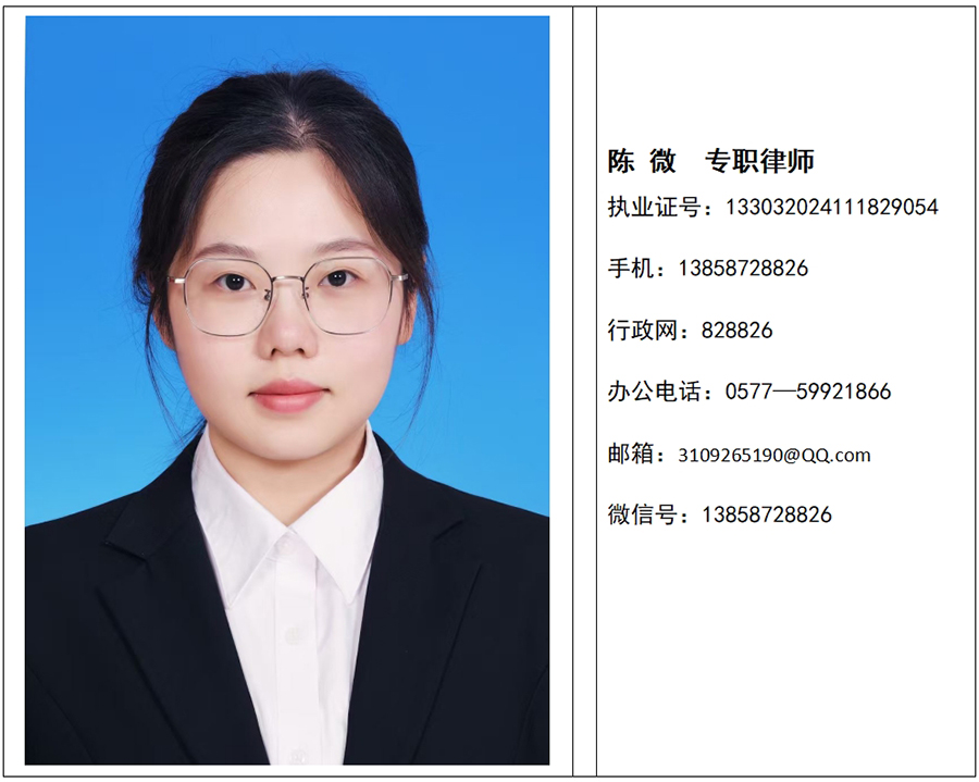 陈微,女,浙江苍南灵溪人,熟悉本土司法实践与社会文化。2023年通过国家统一法律职业资格考试,2024年正式执业。参与办理过上百起民商事诉讼案件,在婚姻家事、交通事故、劳动争议、工伤赔偿、合同纠纷等法律领域,拥有丰富的办案经验。将理论与办案实践相结合,以最大的热情和激情为当事人争取最大的利益。